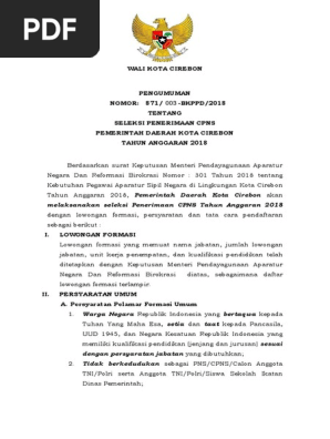 Pengumuman Hasil Skd Dan Peserta Skb Penerimaan Cpns Pemerintah Kota Cirebon Tahun 2018 Badan Kepegawaian Pendidikan Dan Pelatihan Daerah Kota Cirebon from bkdiklat.cirebonkota.go.id Untuk mengikuti seleksi cpns 2018, ada beberapa prosedur yang harus anda lalui. Dengan ini menyampaikan surat lamaran agar dapat mengikuti seleksi penerimaan calon pegawai negeri sipil di pemerintah kabupaten batang hari tahun anggaran. Informasi lain terkait seleksi cpns tahun 2018 : Pemerintah kabupaten cirebon sudah menyiapkan tanah seluas 7500 meter, untuk pembangunan gedung kantor komisi pemilihan umum kabupaten selain itu ia juga berharap, warga bisa memahami siapa calon yang layak dipilih, dengan melihat kemampuan yang dimiliki. Proses seleksi penerimaan cpns tahun 2018 ini terbuka untuk semua warga negara indonesia. Previous story denah lokasi seleksi cpns kabupaten jember tahun 2018. Hubungi kami badan kepegawaian, dan pengembangan sumber daya manusia kabupaten cirebon jl. Pada tahun 2019 pemerintah kabupaten cirebon provinsi jawa barat kembali membuka lowongan rekrutmen calon pegawai negeri sipil/penerimaan pada penerimaan cpns 2019 ini pemerintah kabupaten cirebon mendapatkan 176 formasi cpns, yaitu sebagai berikut :